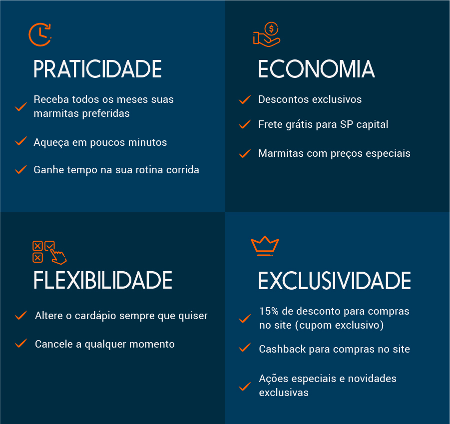 - A cobrança é feita mensalmente e nenhum cupom se aplica à assinatura de marmitas